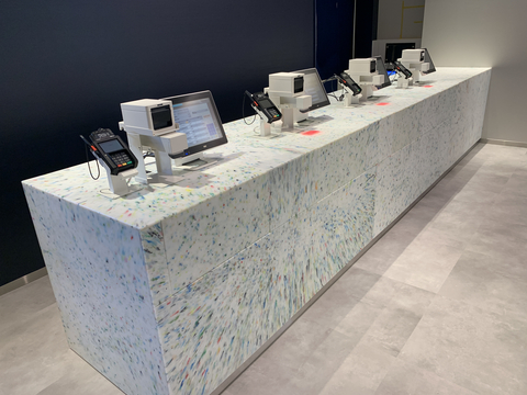 The exterior walls are made of “plaster without artificial substances,” which is made by reusing 336,000 shells that would otherwise be discarded and using glue and other ingredients made from seaweed. For the pictograms at the cash register counters and restrooms, a total of about 100 kg of discarded plastic bottle caps and milky-white polyethylene tanks were used, reducing CO2 emissions to about one-third of what would be produced by incineration. In addition, a part of the seat numbers and the logo sign in the wind shelter are made of about 15 kg in total of recycled fishing equipment such as ropes, buoys, and baskets. The benches in the waiting area are made of cedar trees thinned in Japan. The “Bikkura Pon®” capsules and other items that visitors can take home with them are also recycled and take-out containers are made of environmentally friendly materials, with the aim of contributing to the achievement of the Sustainable Development Goals (SDGs).